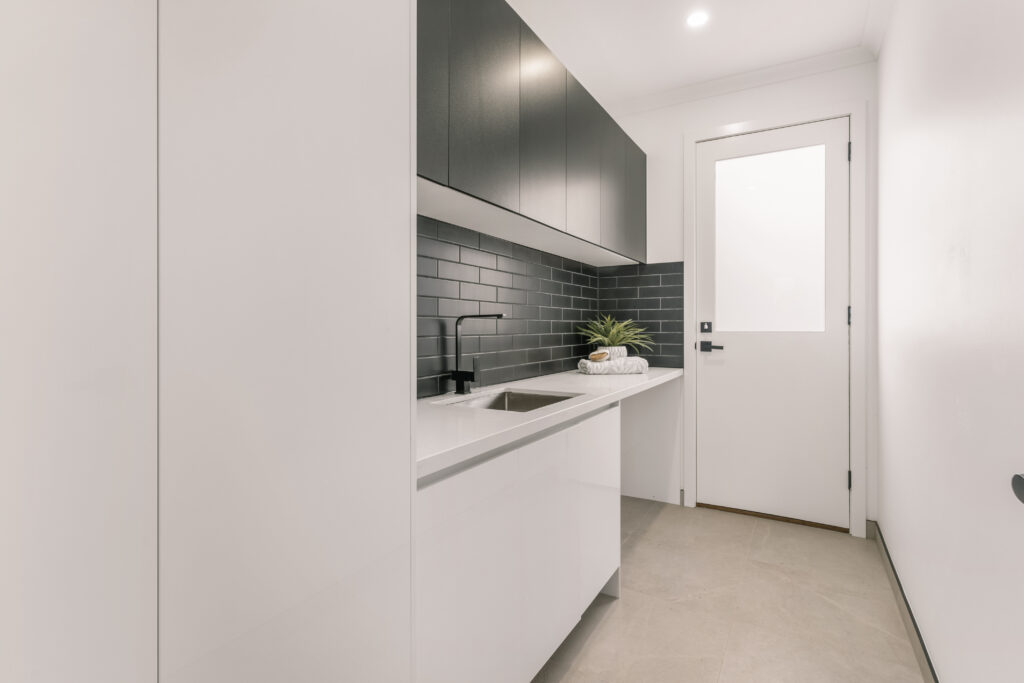 - Solid flush panel or aluminium sliding laundry door – plan specific.