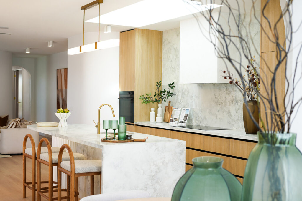 Drawing inspiration from the coastal beauty of Palermo, this home showcases a calming palette of white and earthy tones, brought to life with sculptural curved walls, soft silhouettes, and a statement island bench that stands in the heart of the home.