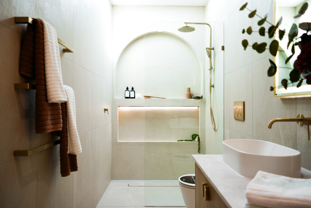 Our ensuite remains a standout highlight, featuring a striking arched shower niche in Venetian plaster, enhanced by ambient lighting and elegant gold accents. Blending beauty with functionality, the Palermo 29 incorporates sleek, built-in, energy – efficient appliances and storage solutions that support modern living.